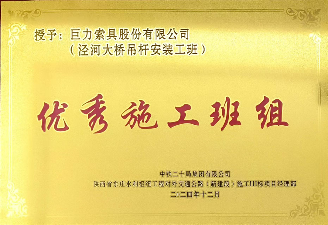在吊索安全器关头,巨力索具公司自觉优化调整功夫的流程,对吊索安全器张拉后的不改中止观察动物,保障安全器安全施工进度与思想道德,为跨河大桥的顺遂全线贯通供求平衡了关头要确保。巨力索具公司也因超卓的实地现场具体表现,被类别部授与“非常好安全施工作业队”的名誉称乎。