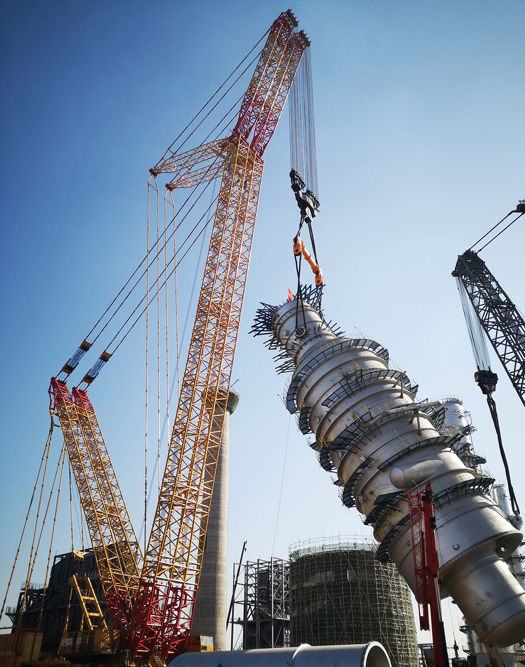 🔯巨力索具的2000t级均衡梁、无讨论绳圈,将盛虹炼化一体化名目常减压蒸馏装配中直径14米,高58米,吊重1717吨的减压塔顺遂吊装就位。
