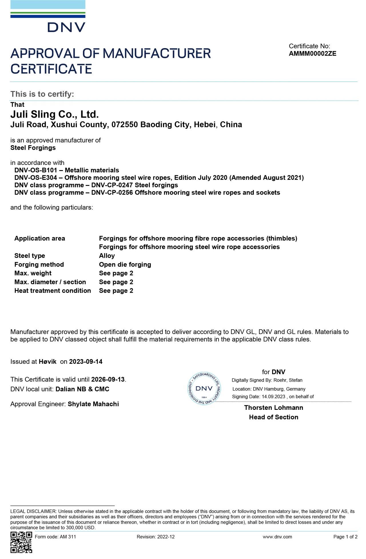 △ 中国船级社(CCS)在巨力索具签发电子证书
